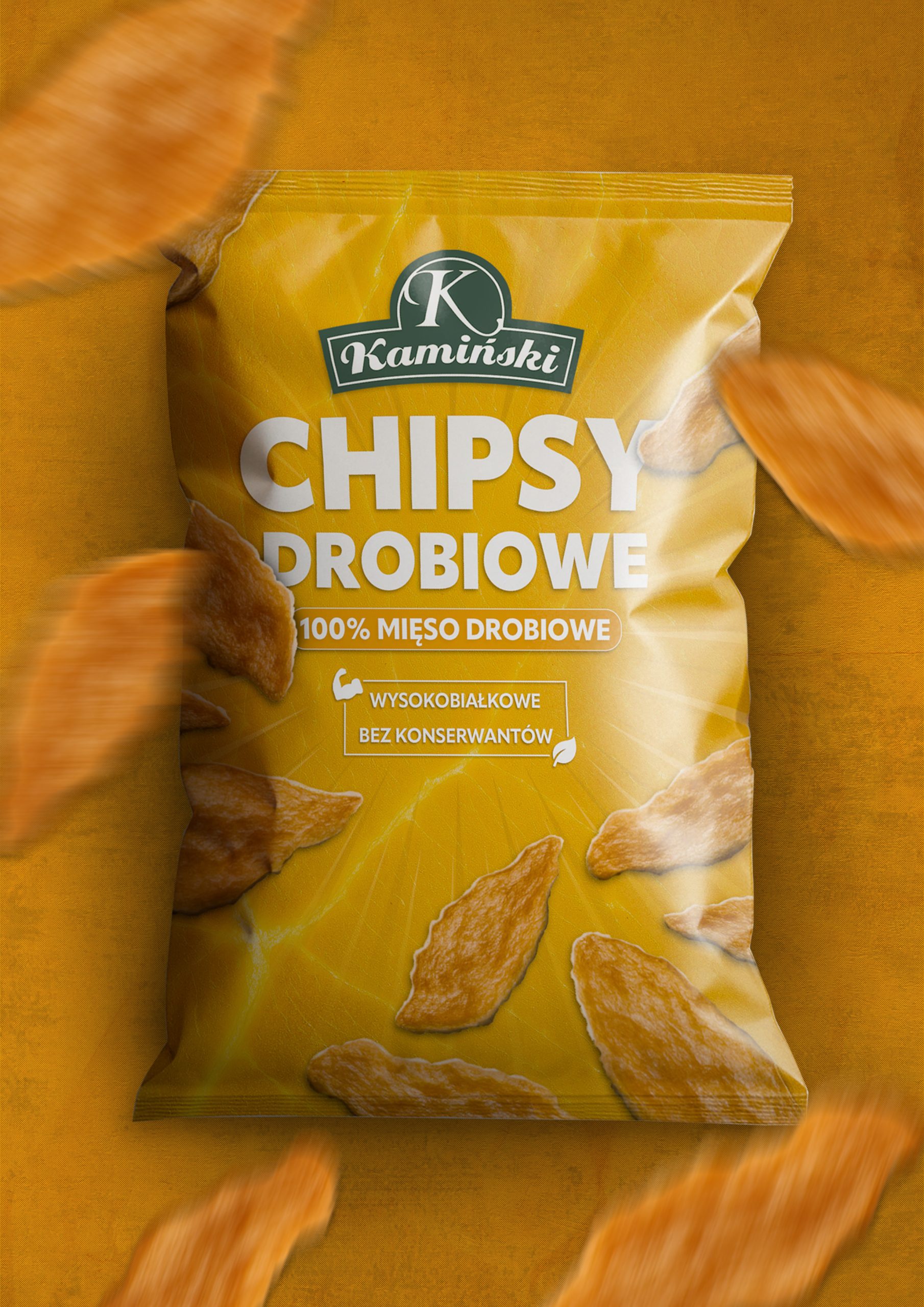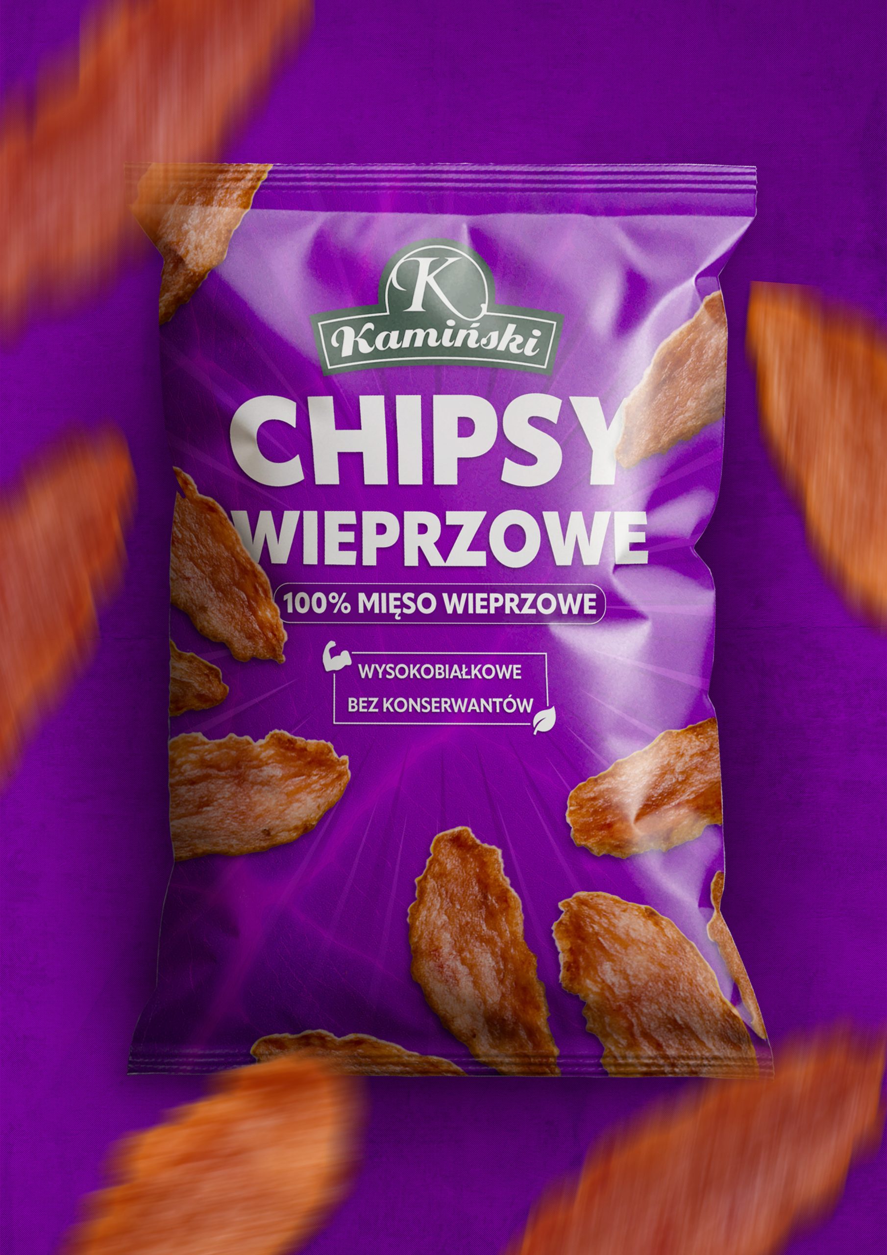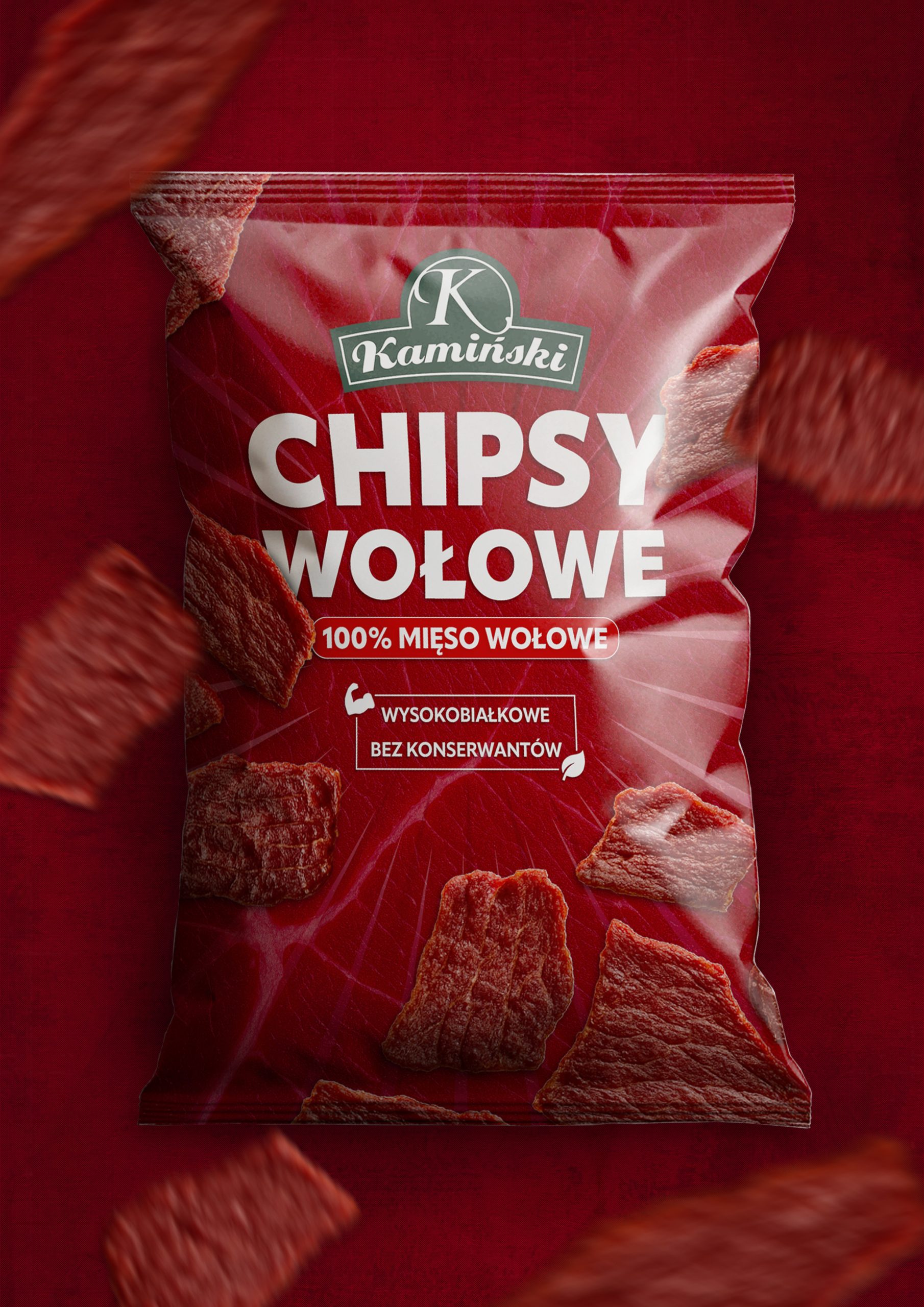 Projekt opakowania mięsnych chipsów „Kamiński” łączy estetykę świeżą i wyrazistą z funkcjonalnością komunikatu – dzięki strategicznemu zastosowaniu kolorów, hierarchii typograficznej i prostym, czytelnym ikonom design zapewnia efekt „stop-sales” na półce oraz odzwierciedla prozdrowotne, wysokobiałkowe wartości produktu, co wyróżnia go w rosnącym segmencie przekąsek proteinowych.