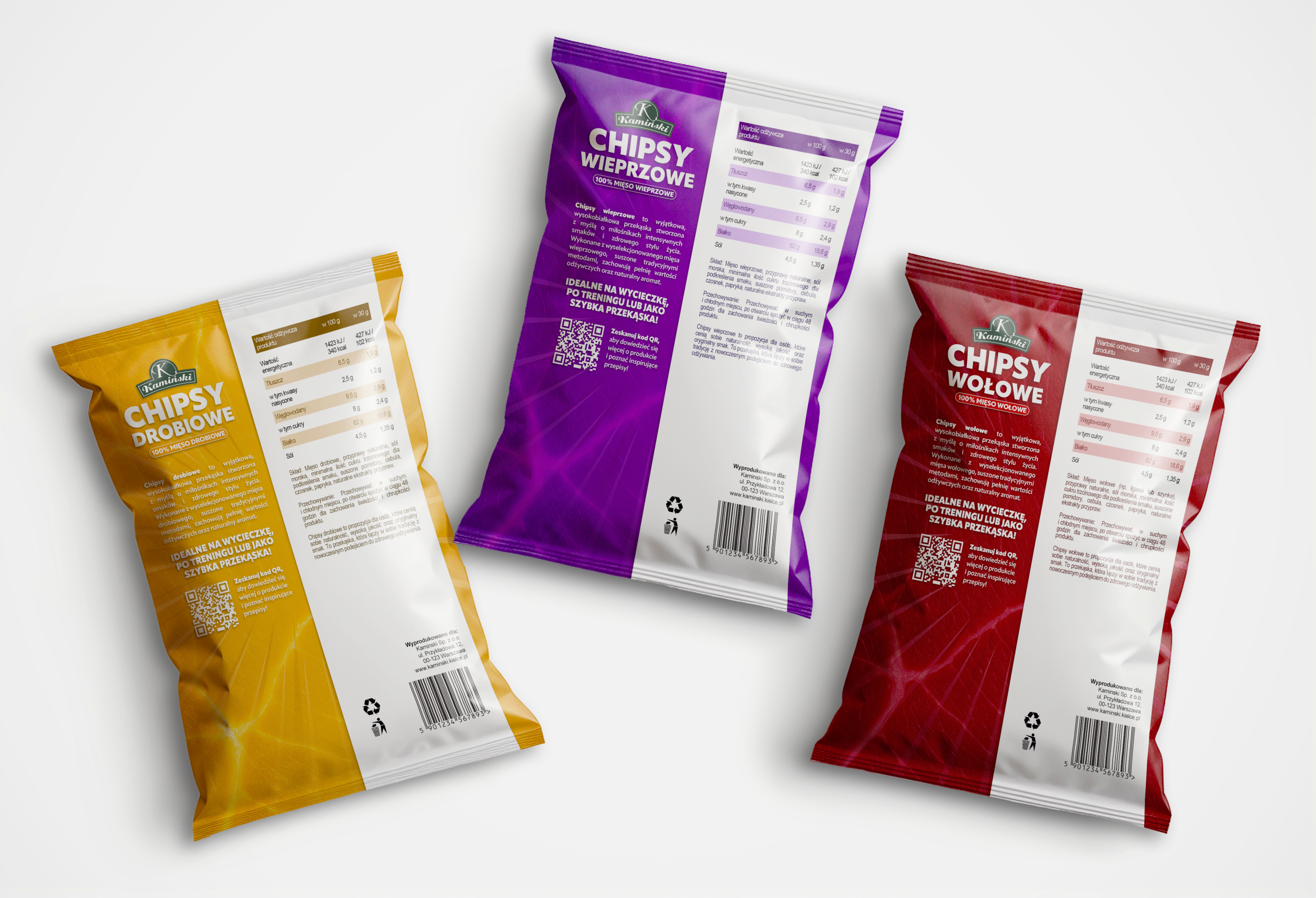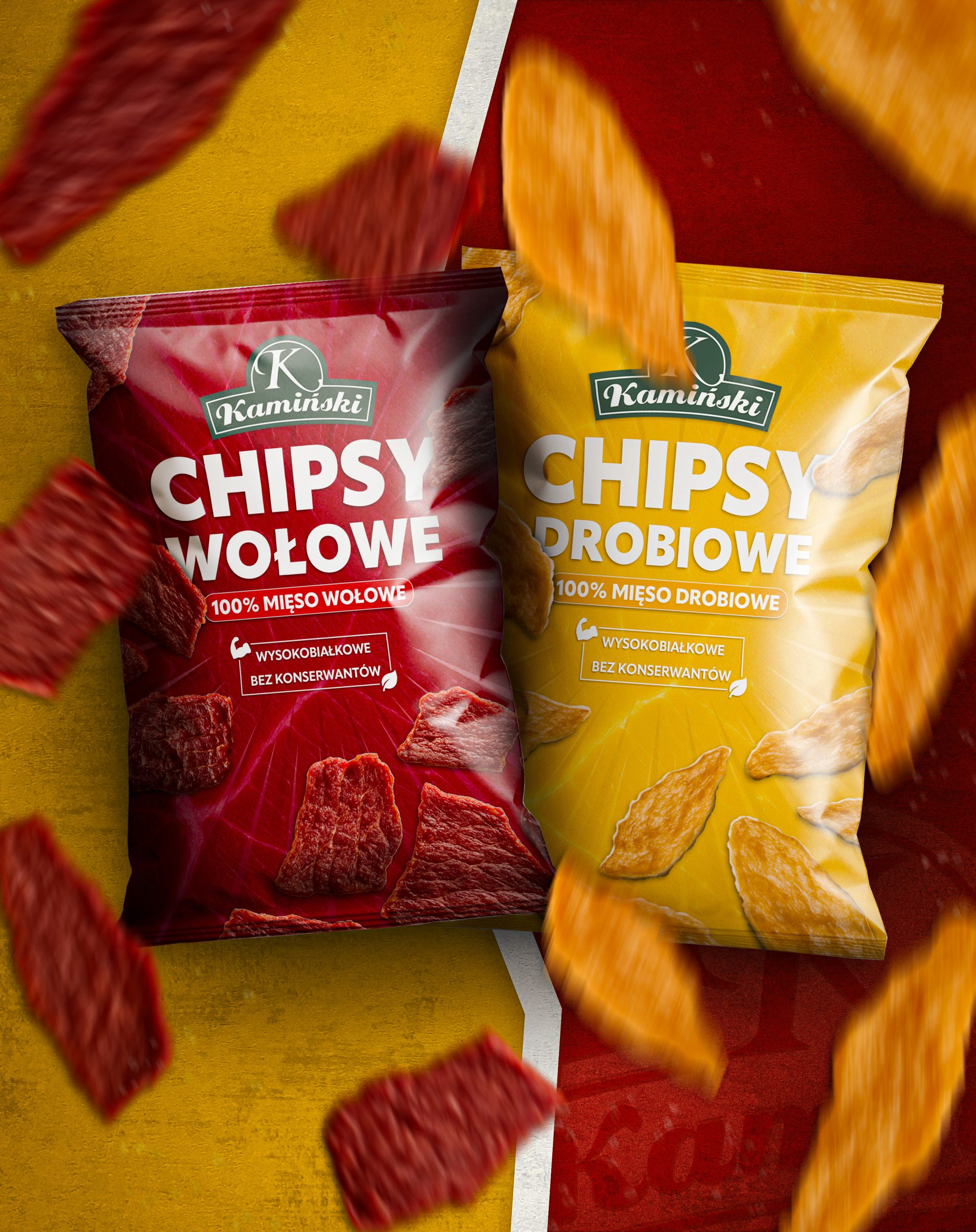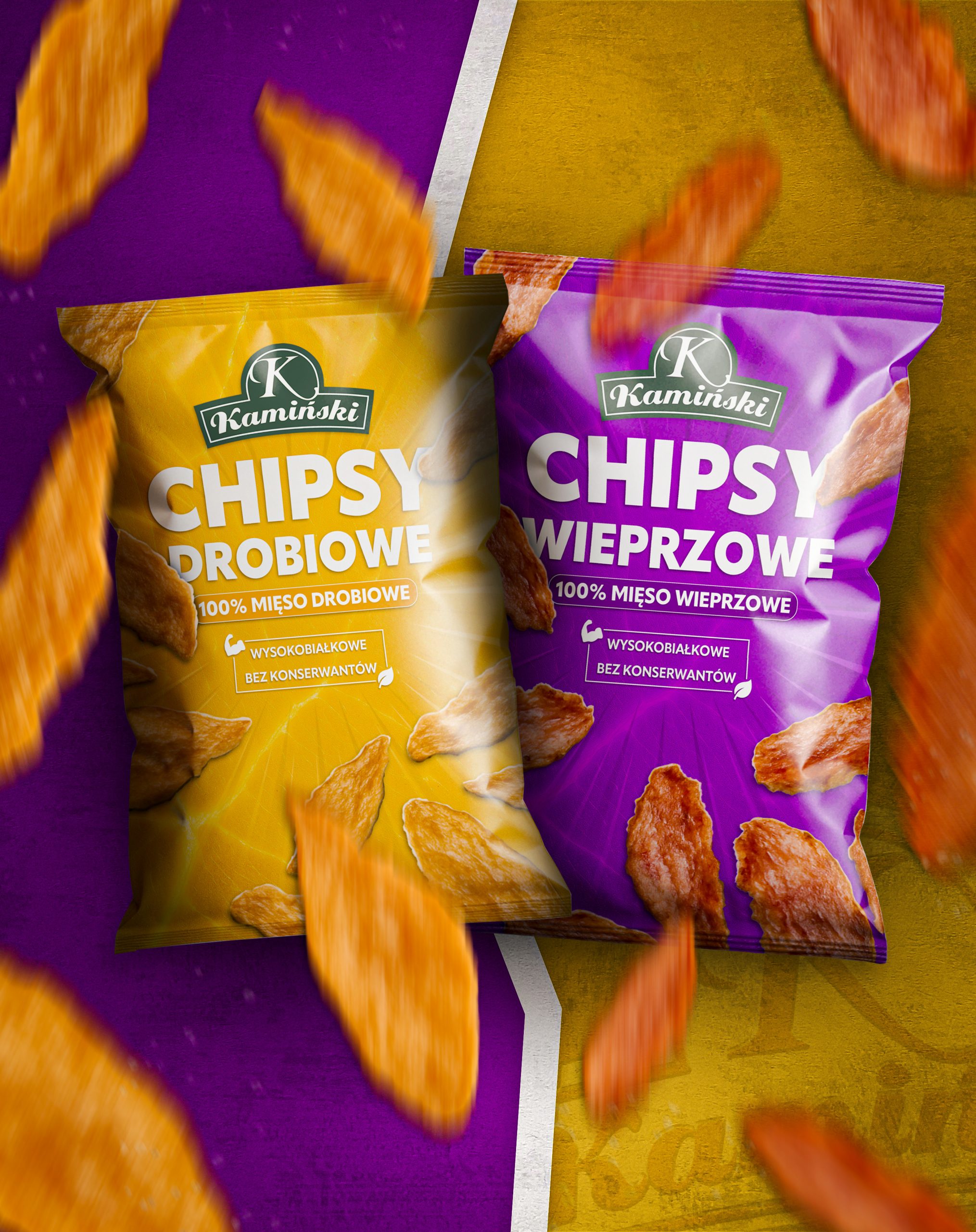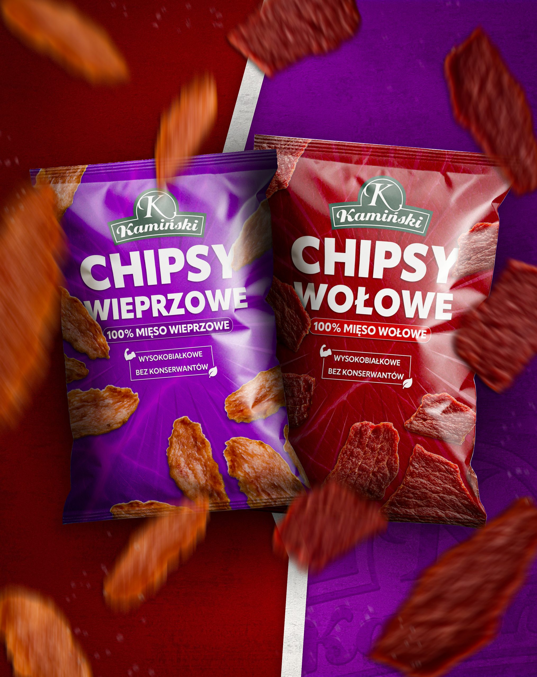 Projekt opakowania mięsnych chipsów „Kamiński” łączy estetykę świeżą i wyrazistą z funkcjonalnością komunikatu – dzięki strategicznemu zastosowaniu kolorów, hierarchii typograficznej i prostym, czytelnym ikonom design zapewnia efekt „stop-sales” na półce oraz odzwierciedla prozdrowotne, wysokobiałkowe wartości produktu, co wyróżnia go w rosnącym segmencie przekąsek proteinowych.